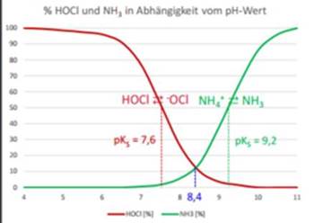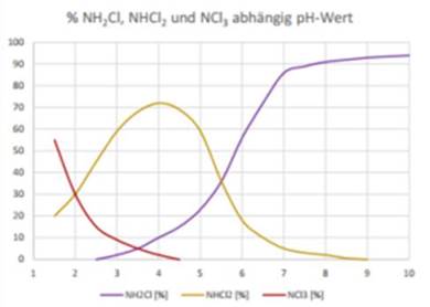 Bei pH-Werten > 7 wird hauptsächlich Monochloramin (MCA, NH2Cl) gebildet, während bei pH-Werten von etwa 4 bis 7 Dichloramin (DCA, NHCl2) entsteht. Bei pH-Werten < 3 setzt bevorzugt die Bildung von Trichloramin (TCA, NCl3), besser als Stickstofftrichlorid bezeichnet, ein.